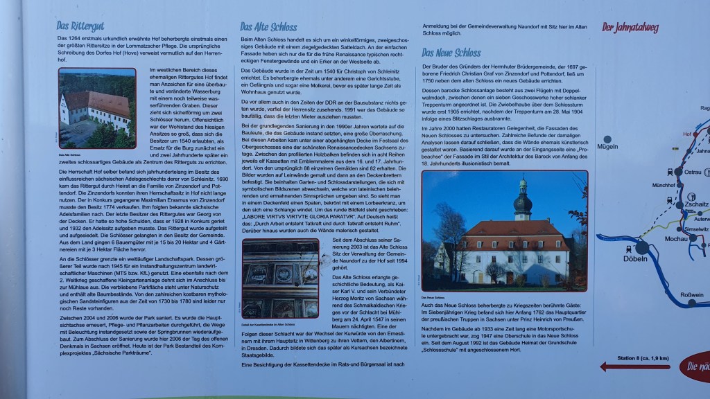 Ein schöner Spaziergang im Park von Naundorf mit dem Rittergut ist einen Abstecher von der Bundesstraße B169 wert. Das alte Schloß beherbergt Sachsens schönste Renaissancedecke